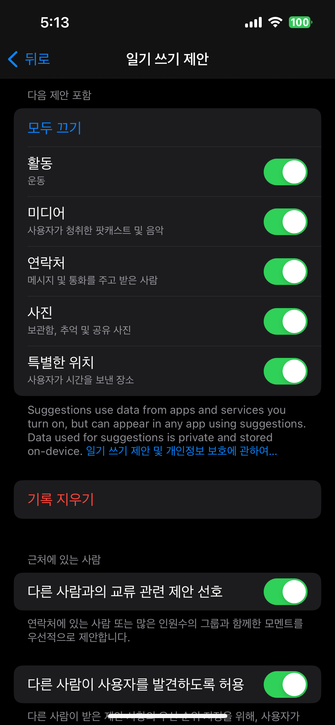 사진과 위치 정보 외에도 일기앱은 자주 듣는 음악과 자주 주고받은 연락 정보를 기반으로도 일기의 글감을 추천해 줍니다. 분명 일기앱이지만 단순한 메모장 수준의 앱이 아닌 보다 섬세한 감수성을 더해 오래간만에 애플의 명성에 걸맞은 킬러앱을 만들어 낸 것 같습니다.