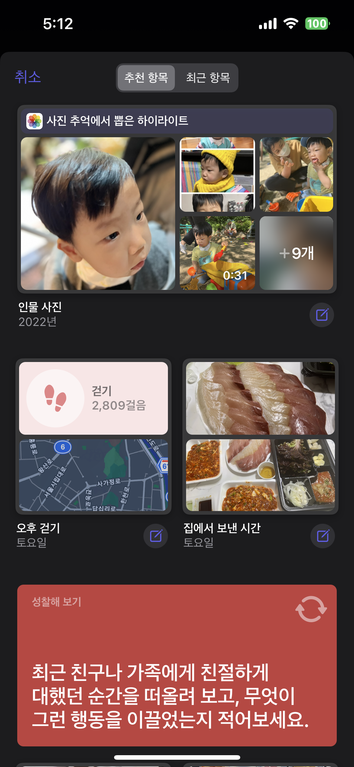 단순히 일기를 작성하고 표시하는 것에 더하여 애플의 일기앱은 그날그날 추천하는 일기 쓰기 좋은 글감들을 개인화 정보를 기반으로 추천해 줍니다.