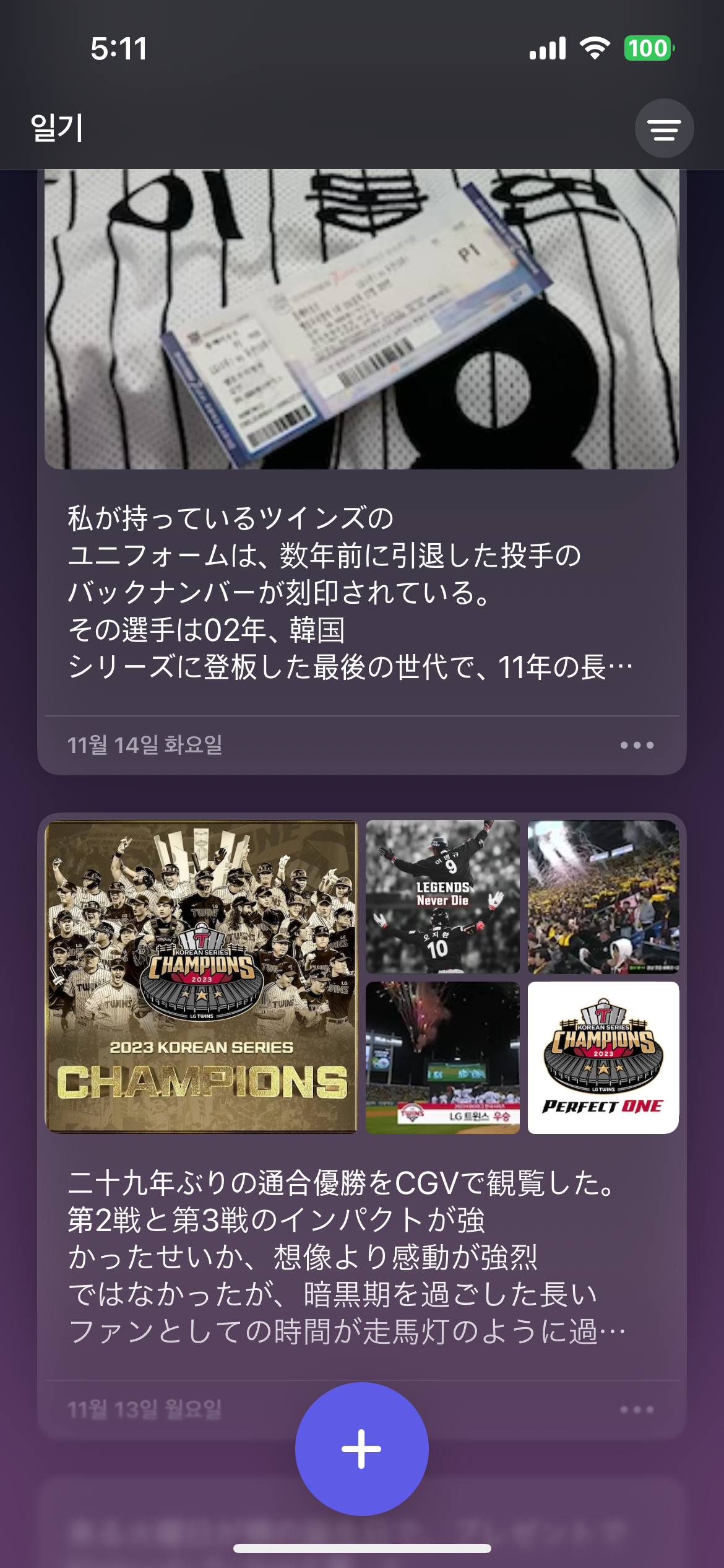 시간순으로 일기들이 표시되는 메인 화면인데요, 어떤가요? 애플의 Cupertino UI와 찰떡이라는 기분이 드는 것은 어쩌면 당연할지도 모르겠네요.