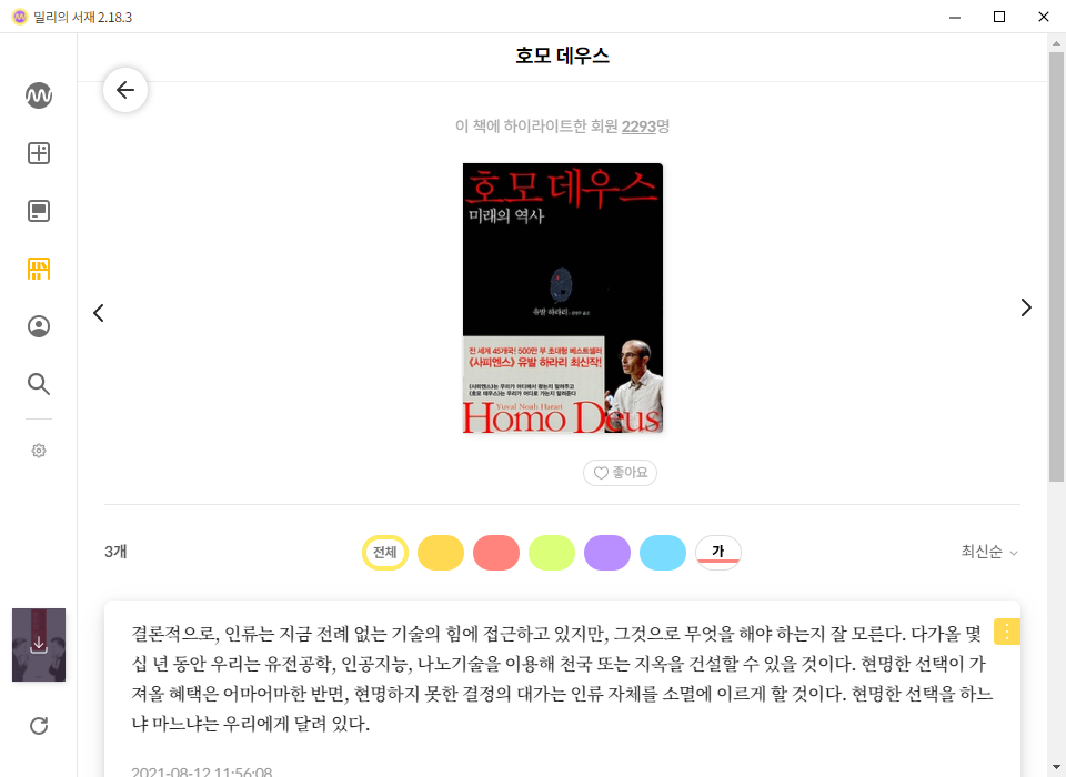 21.0814 추가 : 밀리의 서재 인앱 독서노트도 어찌어찌 사용하다 보니 익숙해지기는 하네요. 독서노트 내에 하이라이트를 최신순/오래된 순 으로 정렬할 수 있는 기능은 리디셀렉트/리디북스에 비해 훌륭한 것 같습니다.