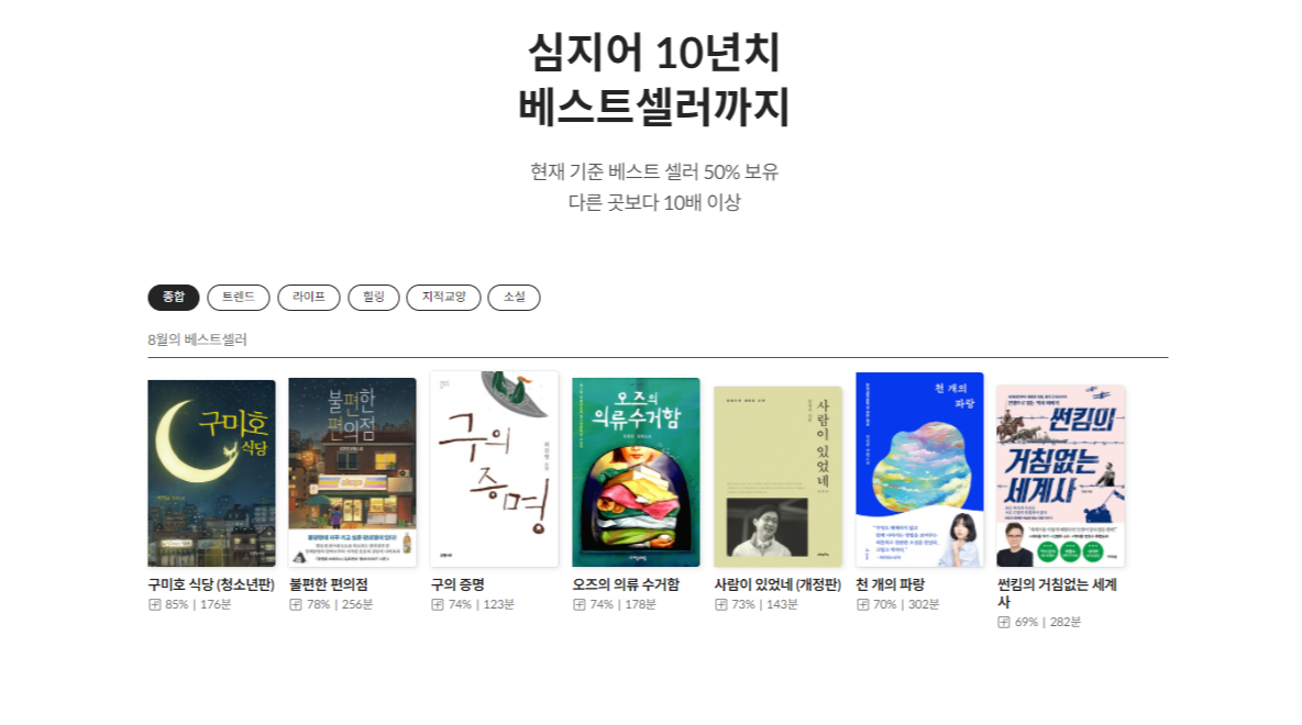 하지만 다른 구독 플랫폼(Yes24북클럽, 윌라)과 비교했을 때에는 위 두 서비스가 (저를 기준으로는) 읽고 싶은 책들이 훨씬 많은 것은 분명합니다.